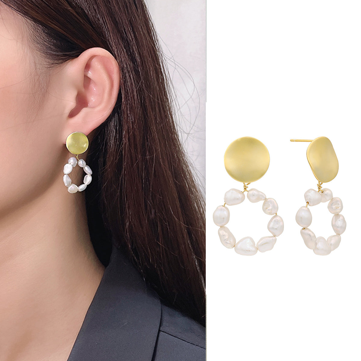Baroque Pearl Hoop Drop Earrings Matte Gold Disc Studs